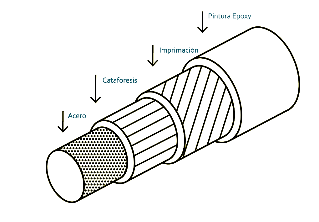 Antes de nada se lleva a cabo una limpieza integral y el pretratamiento de la pieza. Los componentes se sumergen en una serie de tanques de inmersión, llenos de agentes desengrasantes, agua purificada y activadores. Después, se ejecuta el proceso de electrodeposición catódica, consistente en un proceso de pintado por inmersión, basado en el desplazamiento de partículas cargadas dentro de un campo eléctrico hacia el polo de signo opuesto. De manera que, aplicando una diferencia de potencial eléctrico, las moléculas de pintura se depositan sobre la pieza de forma uniforme. Este proceso produce un recubrimiento antioxidante que permite que nuestros productos permanezcan en el exterior durante varias décadas. Se lleva a cabo de acuerdo con los estrictos requisitos medioambientales definidos en ISO 12944.